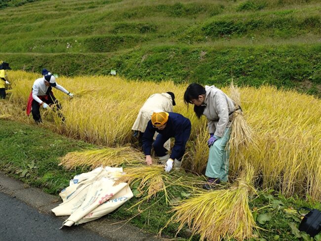 10月12日(日)小倉の千枚田で「トキの島小倉千枚田農園」オーナー稲刈りイベントが開催されました。