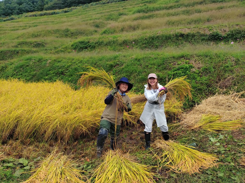 天気は、時折雨が降るあいにくの空模様でしたが、みなさん楽しそうに稲刈りしてました。